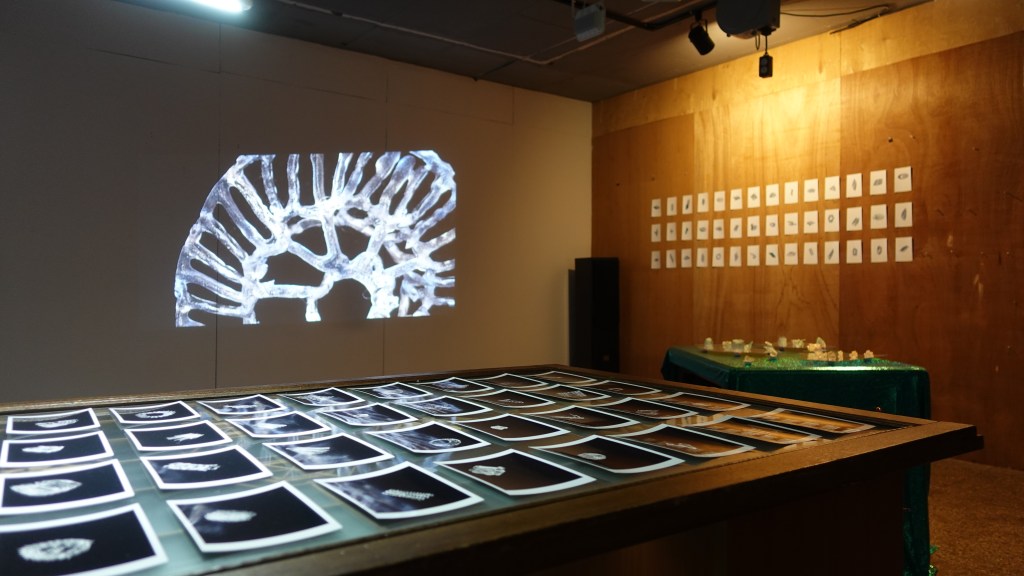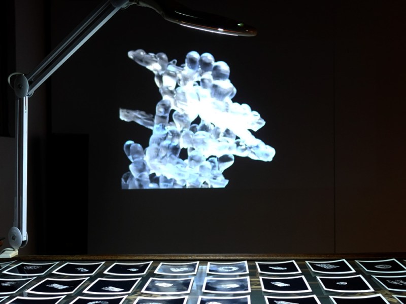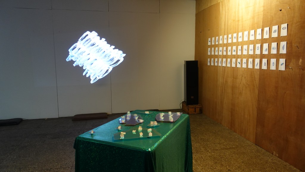 <물질 감각 생성>展은 작가의 오랜 관심사였던 감각과 물질의 생성에 대한 실험을 보여주는 전시이다. 가상현실 공간에서 만들어진 3D 데이터를 현실 공간으로 옮겨오는 과정을 보여주는 프로젝트로 작가는 중력 혹은 물질이 갖는 물성을 초월한 가상의 공간에서 몸의 움직임으로 생성된 데이터를 만들고 이를 다시 3D 프린팅을 통해 물성을 주입하여 물리적 공간으로 가져오는 생산을 반복한다. 3D 모델링 데이터를 3D 프린팅을 통해 실제화 시키는 이 작업을 통해 작가는 기술 공간과 현실을 연결시키는 매개로서의 물리적 몸과 이것이 생산해내는 감각과, 데이터, 그리고 물질화의 과정을 보여준다.