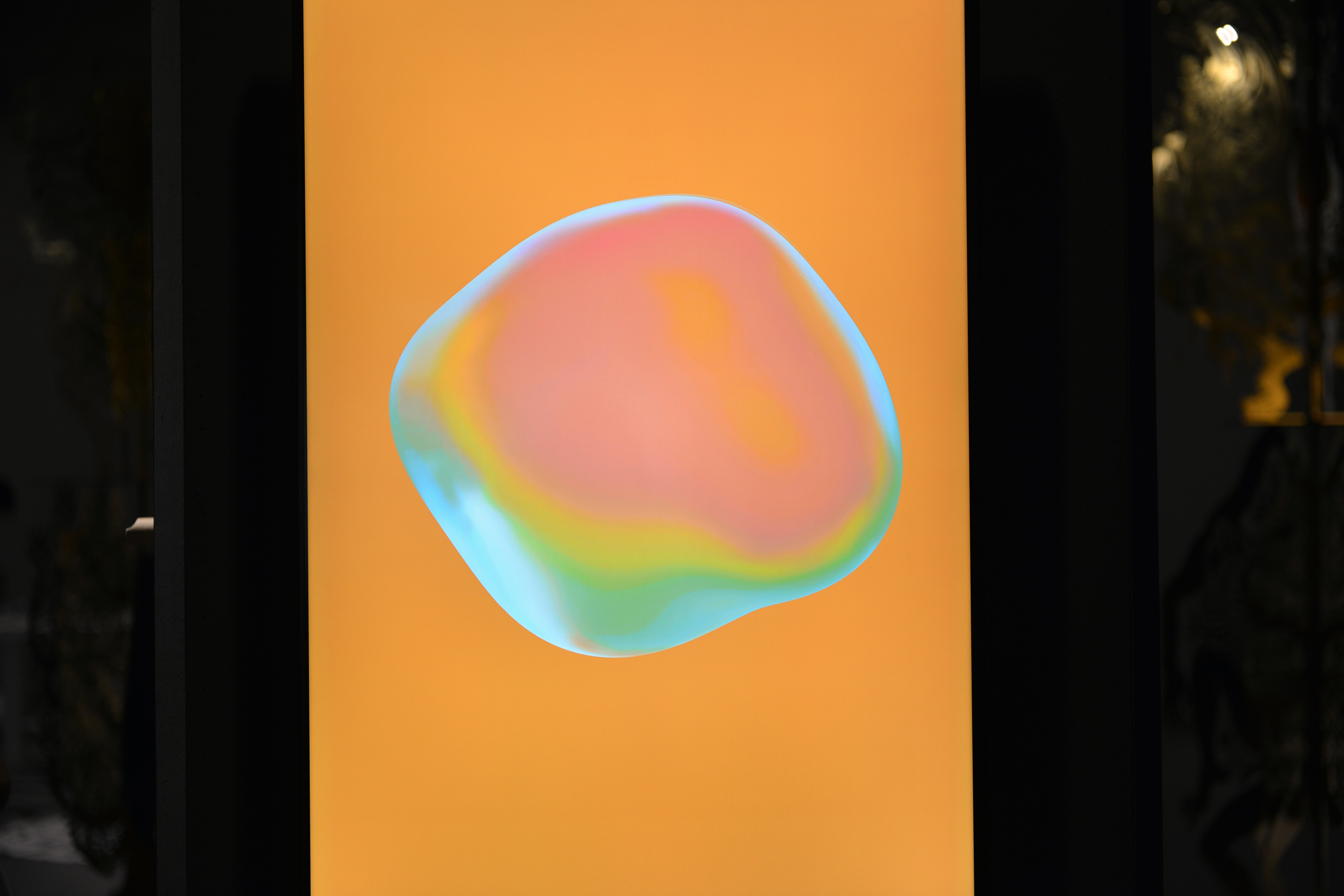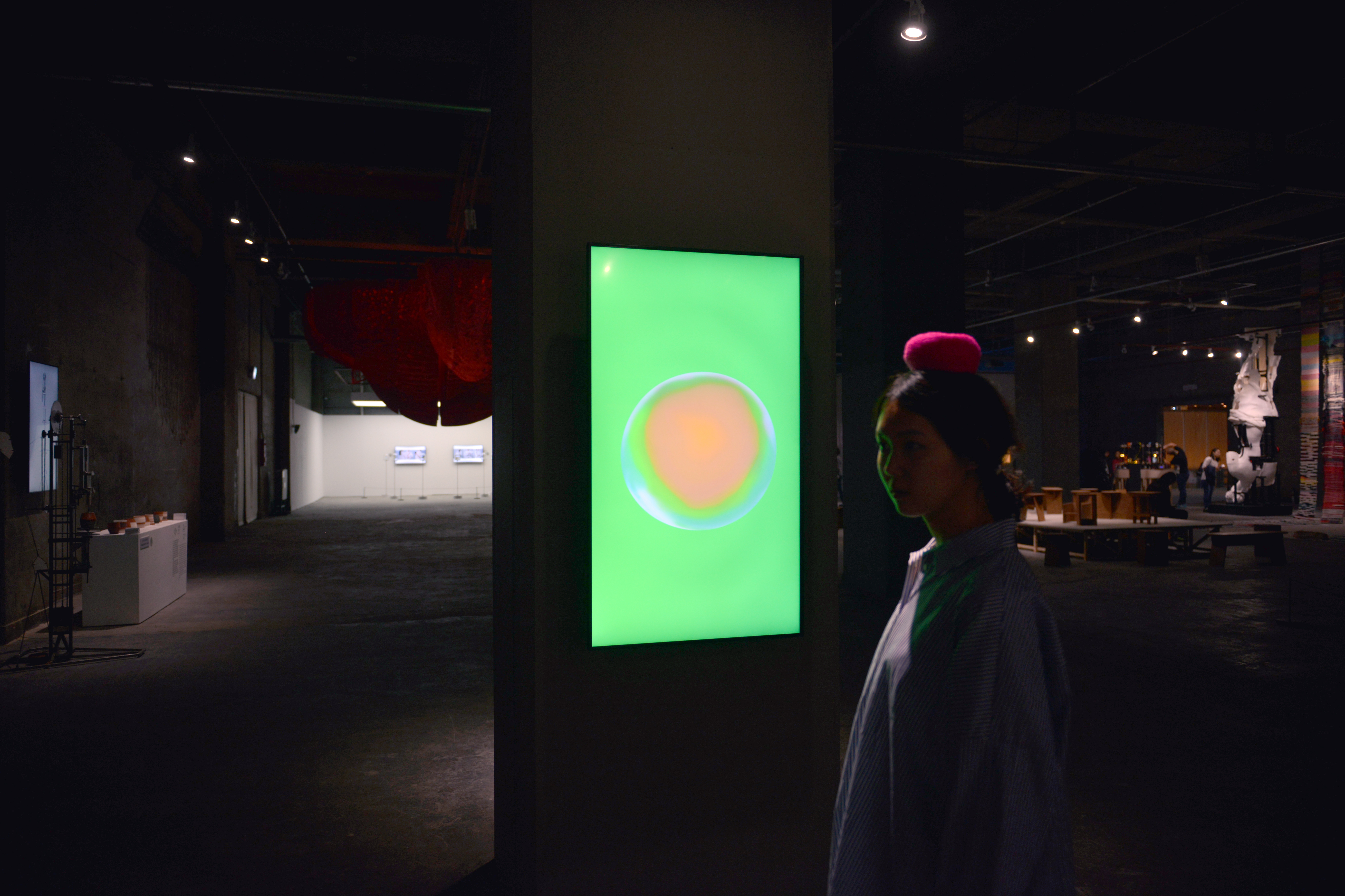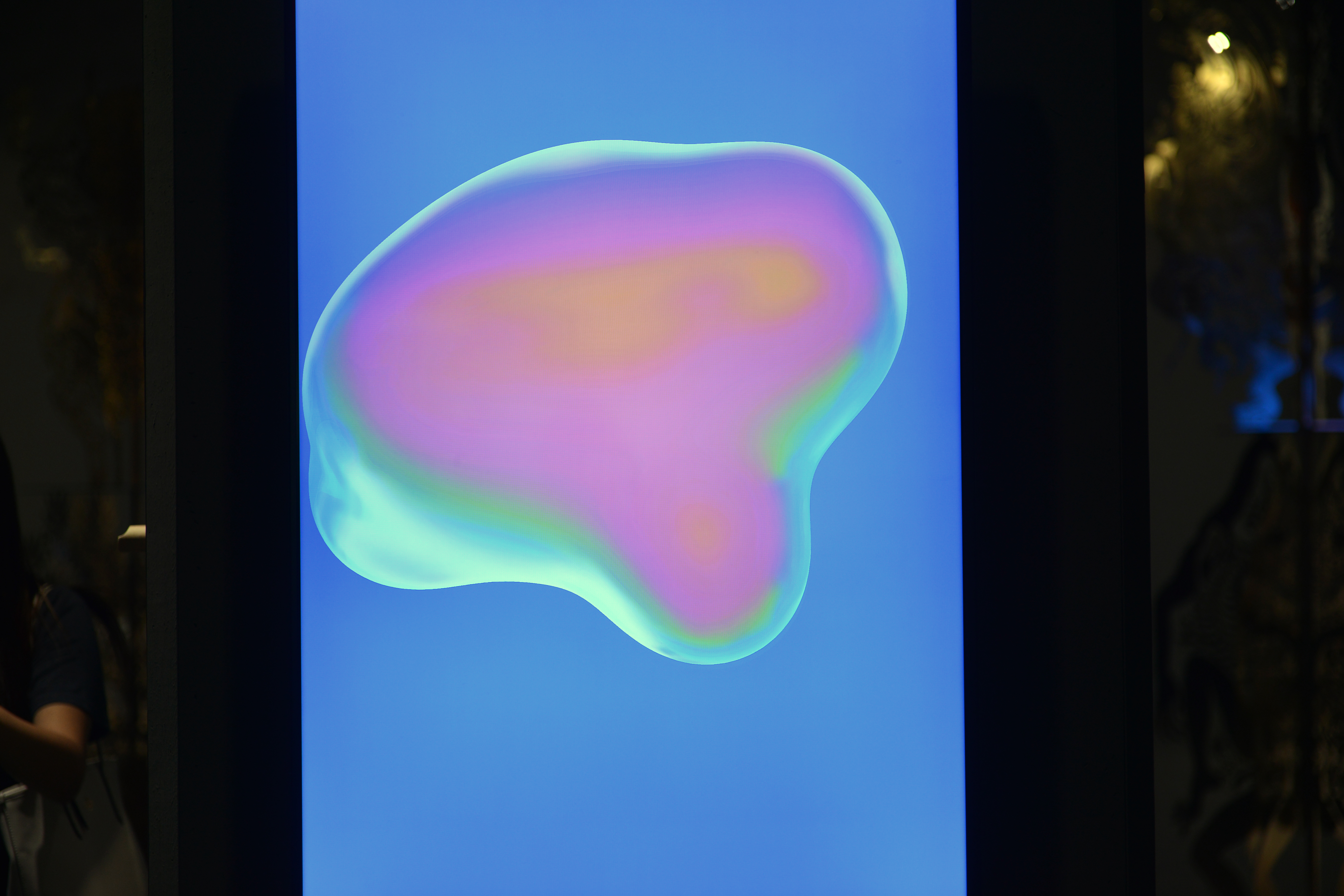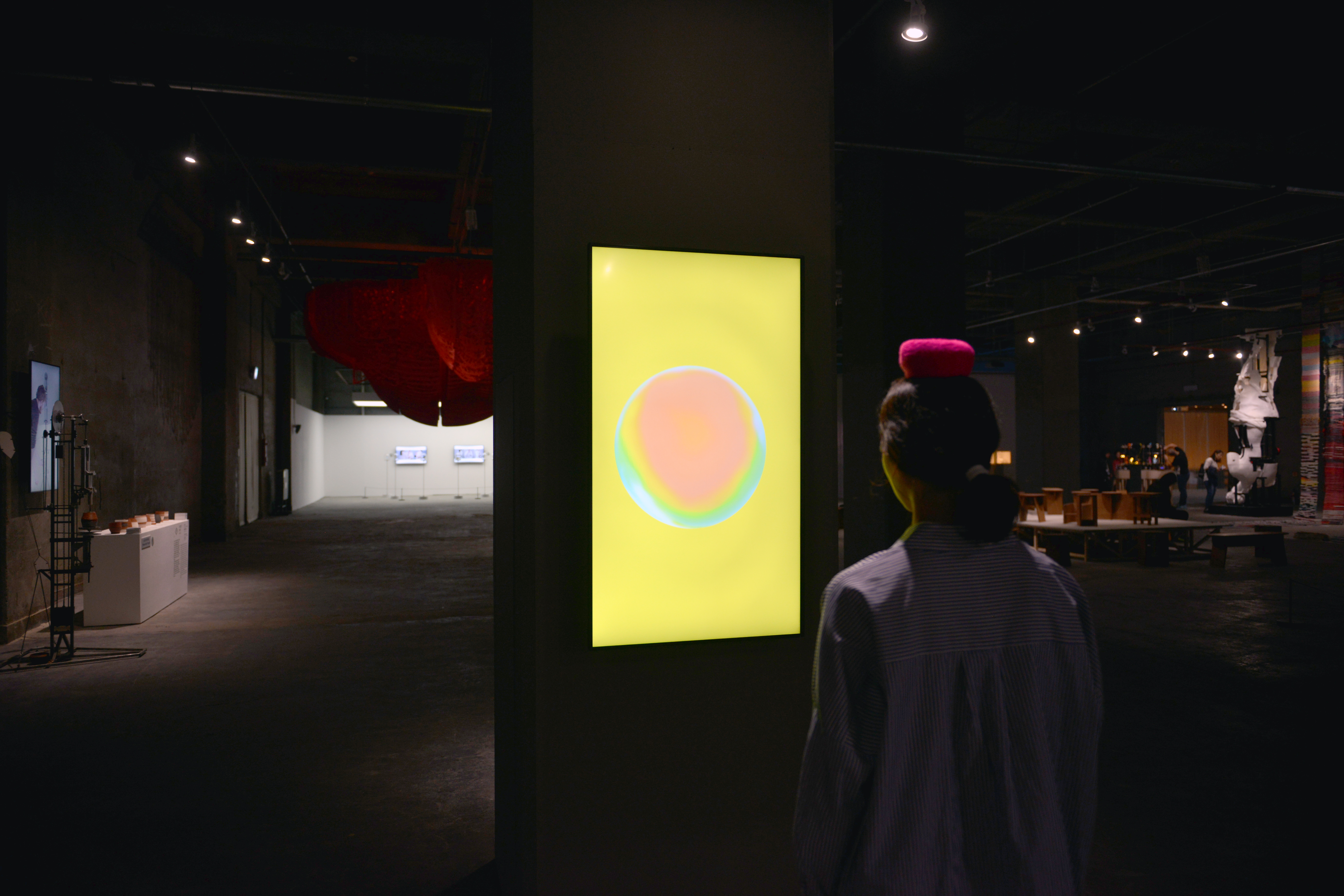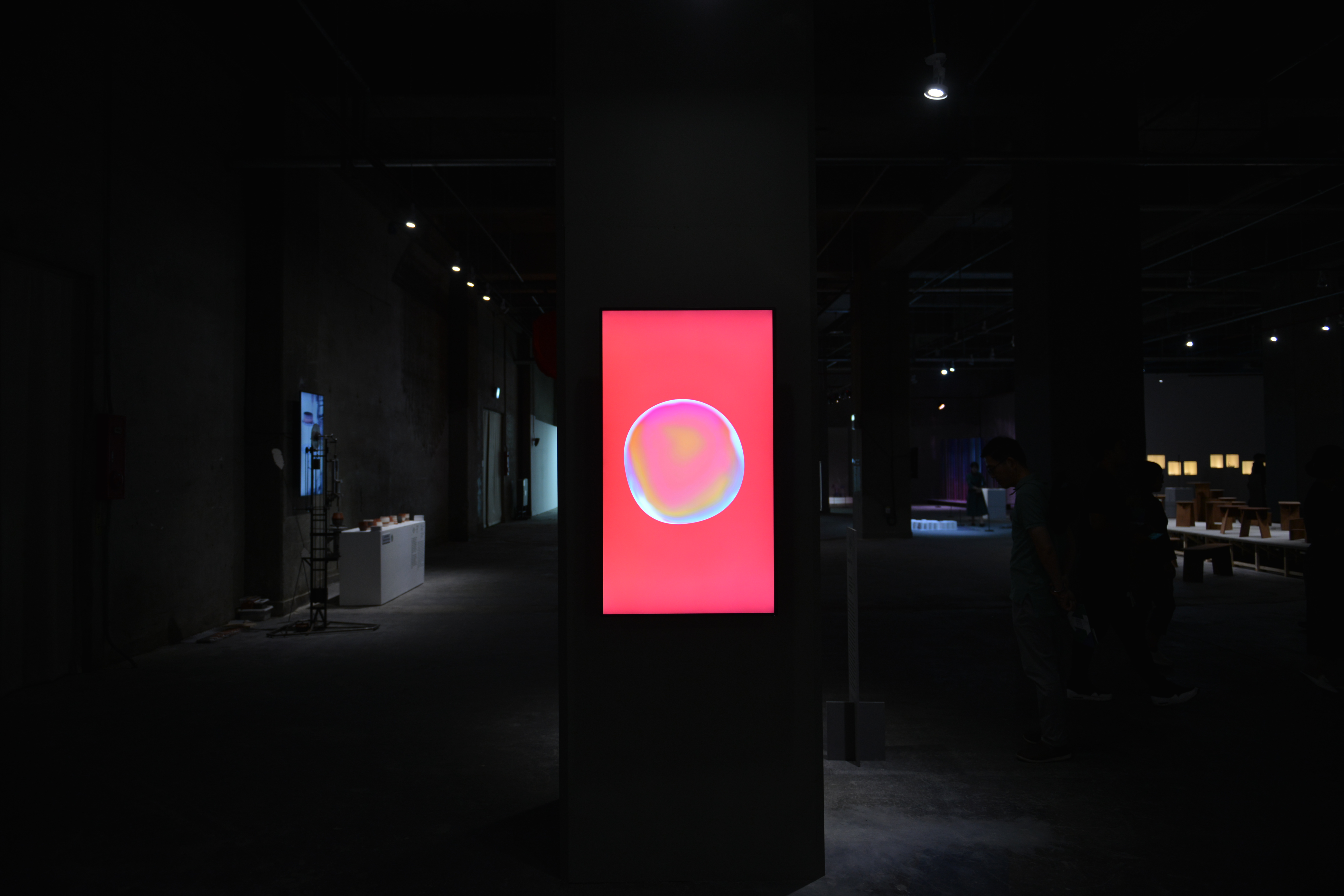 똬리¹[머리에 이다] 관객이 똬리를 머리에 얹고 고개를 좌우로 움직이면 스크린의 공기방울 이미지가 변형되며 사운드를 발생시킨다.똬리는 딱딱한 물건을 이고 나를 때 완충 역할을 하는 운반 도구이다. 공예로서 재해석된 똬리는 머리에 무언가를 이는 도구이지만 무거운 사물이 아닌 스크린의 이미지를 얹어낸다. 조작의 인터페이스로 변화한 도구가 주는 또 다른 신체의 제약을 관객은 경험한다. 경쾌한 소리와 함께.
