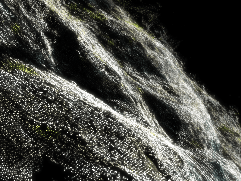 She produces voxel data from photos of islands floating on the South Sea of Korea and processes the “image” we perceive with technology to show it in a different dimension. The extracted voxel data is stopped information, but it moves with arbitrary motility caused by noise. Due to this motility, the image of the photograph is dismantled and transformed into a point where it is unknown whether it is an island, matter, or particle.